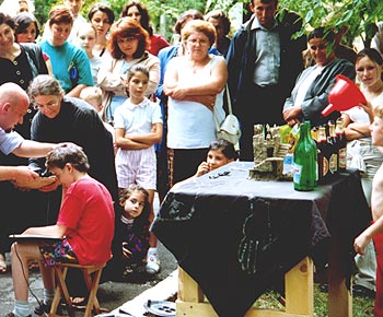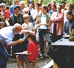 For the opening of the Sculpture Symposium, we did the performance 'A Rite of Passage'. Here my long-haired 11-year-old son sat while Tudor Cordos cut all his hair off. At first the crowd wanted him to stop, but later they were encouraging him to do a better job! Toroa is at the point of moving from childhood to adulthood and the cutting of his hair, which I then collected and spread out onto successive pages of an illustrated book of Romanian folk tales, symbollised this passage. |