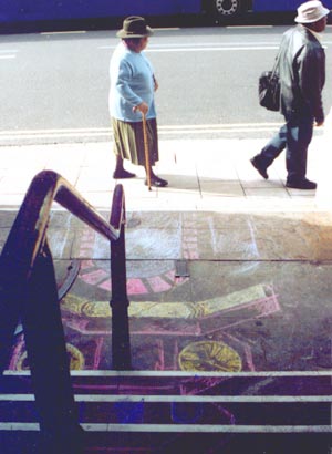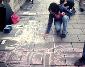 Colonising Oxford by drawing The Oxford artist here is Diana Bell. A number of Oxford residents were each presented with an image of Leiden and were instructed to draw from this image onto the footpath in chalk. The idea behind this was that images from my city (as coloniser) were being imprinted onto the street by the locals. I chose to be 'liberal' in my colonising, in the sense that the 'colonised' (those drawing) were given the freedom to express this onto the pavement without any restrictions. This performance required local artists to respond to black and white pictures from a foreign place, to draw images of another country -- as they pictured it -- on their own streets.