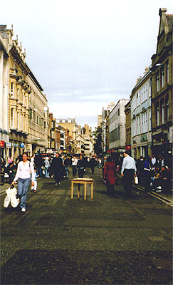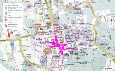 On the morning of October 2nd she organized a photo session for all of us at the city council and then after this there was an interview with the local BBC radio station back at the studio. This was aired on Thursday morning but I didn't hear it. Actually everything went very well, only that I was aware that Diana was doing a lot of the coordinating, single handedly, and so I decided not to contact her unless it was necessary. Then in the afternoon I went with Hilary, a very youthful looking 50 year old, into the city centre to look at sights for my performances. We had to check out alternatives incase it rained. Diana is lovely but seems overly worried that things should be 'well' organized and told us (rather than suggesting or asking) that we had to look at all the alternatives. I saw the covered market -basically a maze of shops, which I found oppressive just being in. The Cornmarket is a pedestrian street (with the occasional service vehicle or police car) and is the main shopping street. So I decided that if it rained we would do the drawing on the steps inside the town hall. May Wylie the city council twinning officier had given permission for chalk to be drawn onto the town hall steps, which I thought was very generous. She had also said that it would be no problem for me to borrow 20 chairs for the "Readings" performance planned for the 12th. We had dinner in a pub on the outskirts of the city at The Trout It was full of Inspector Morse memorablia, with items glued to the mantelpiece. I was told that some shots of the tv series were shot here. |