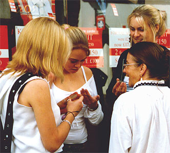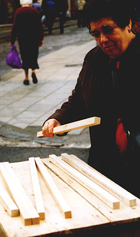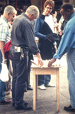 "Change is a Law of Nature" - October 4th: I presented myself as a Dutch artist with art currency to trade. Each translucent coin bore the text "Change is a Law of Nature". My job was to convince them of the worth of this currency. Although it appeared that I was encouraging them to buy or trade with me, we often ended up discussing the issue of �value� or �values�. What they really were valuing was the trust they developed in me, the artist, and through that the art object. |