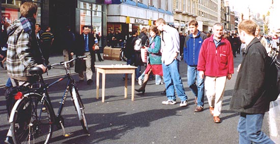 Colonising Oxford - The Exchange Table The table was amazing. It belonged to Finn, Clare's son and it was so good that she let me sand it and then take it away (which ended up being for 4 weeks). Diana took it in her car to the city council for me, where I stored it. So all I had to do was to carry it a matter of say 50 metres each time I took the table out. I'd put the table out for a few hours and then sit or stand nearby just watching people. Me, the coloniser, taking time out just to observe. More about this performance |