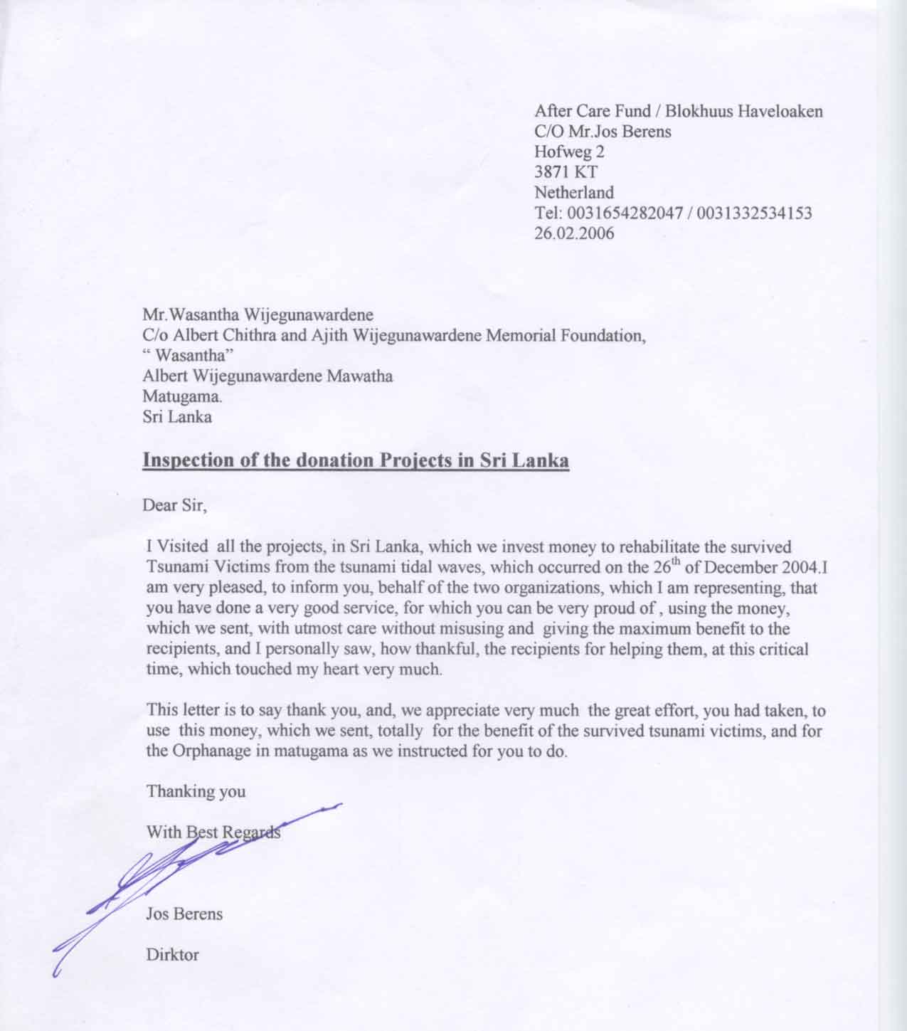 Because I have finished, all my projects successfully, with the help of my well wishers, I take this Oportunity to thank all people who trusted me and helped me in my projects.Also I put all the money which I got only in specially selected places where most of the donors knew and thinking that it was very necessary according to my knowledge and personal supervission.I did my best to give all information about them through this website.Anytime any one can visit these places and see the progress from their own eyes and talk to them and enjoy the happiness with them.All addresses and telephone numbers are also given in each webpage.While doing these projects there were obstacles and problems which we had to face and were beyond our control and we had to bear the shortcomings.I regret such inconvieniences and shortcomings which the donors had,.I should say with all that,still we can be very happy, that we did a great job, at the correct time, when it was nesessary, for some unfortunate people, who lost their happy life.They are happy now, and we are happy too. Finally again, I thank from the bottom of my heart on behalf of the Tsunami Refugees all who helped us at this critical disaster time spending their valuable time,money and strenghth and courage given to me to do all this work. I wish Long Life, Good Health and all the success in your work Wasantha Wijegunawardene (Tour Guide) in Visit Lanka (Pvt) Ltd,Agent For Fox Vacanties Nederlands. |