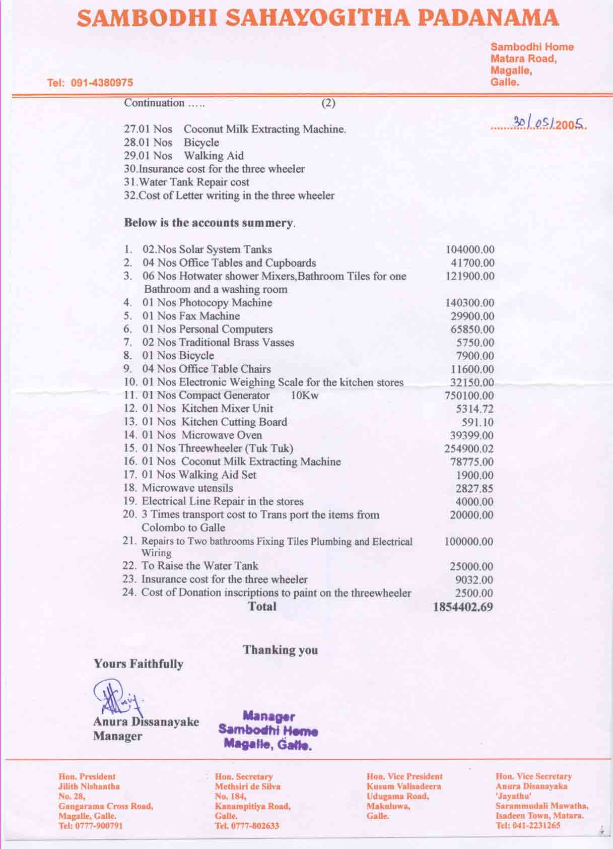 WE bought almost all things they asked.Items are mentioned in the summery page with the cost.At the moment we are repairing one toilet and a washing room.Everything is almost finish.We have to bring some machinary for the kitchen and to fix the generator .and to raise the water tank to fix the solar hot water panels.Then we finish the project.
