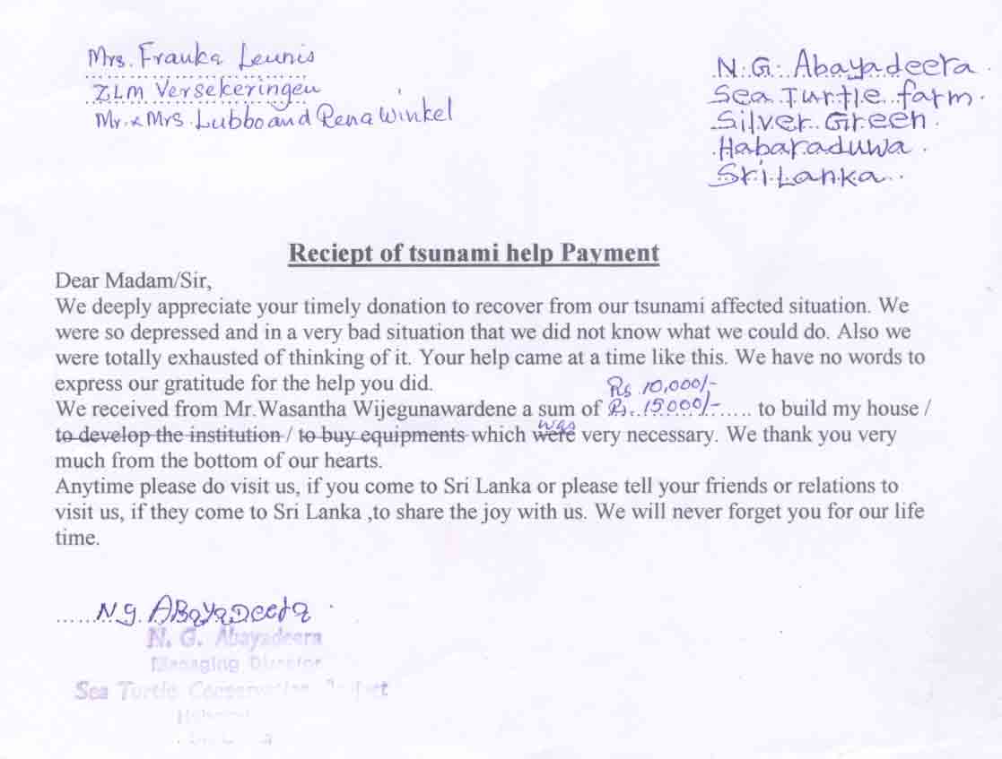Why I selected this to help is, because, Sri Lanka is an Island, which is protected by a beautifull coral reaf.This coral reaf is damaged by a fish called star fish.Turtles eat this star fish.Earlier people didn't know about this, and they collected the turtle eggs, when they came ashore to lay eggs and ate them.Tutles come three to four times a year to the same beach area to lay eggs and lay about 150 - 200 eggs at a time in the night.but when they got to know that, tutles are important to protect the island, they sold the eggs to these, turtle farms instead of eating them.What the turtle farm does is, to hatch the eggs naturally, and after 65 days when the turtles come out, they keep them in a tank, for about a week, untill they are grown bigger, and send them back to the sea in the night. Naturally if this happens many turtles are eaten by eagles and big fish. and only about 25% of the hatch are surviving.There are 5 types of turtles out of 7 types in the world in and round Sri Lanka beach area. These people who are doing this farm voluntarily are doing a great service to protect the island indirectly.That is the reason why I selected them to help.otherwise they will be discouraged and later people will go back to what they did at the biginning eating the turtle eggs.Also by law because of this reason turtles are prohibited to kill.There is a new turtle sactury also in the eastern coast of Sri lanka now. They have started rebuilding the farm.you can see the progress from the photoes.If I have more money I will give them some more money to repair the house which they live which is infront of the farm.You can see the state of the house from pictures. |