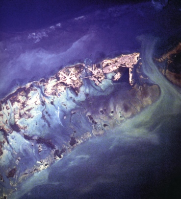 | Earth IV The Florida Keys, a group of islands at the south peak of Florida, USA. The group is about 240 km long. Since 1938, there are several bridges connecting the islands with each other. You can see the the Key West Naval Air Station in the middle of the photo. |