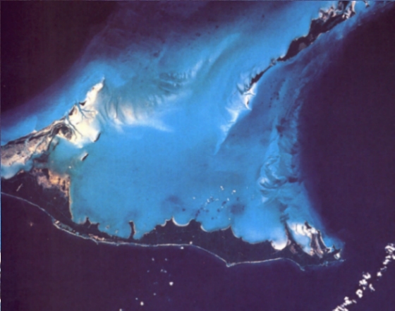 | Earth V The south peak of Great Exuma Island and the north peak of Long Island. Both islands belong to the Bahamas. |