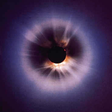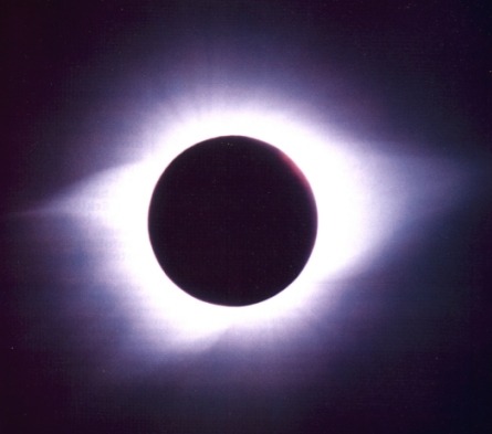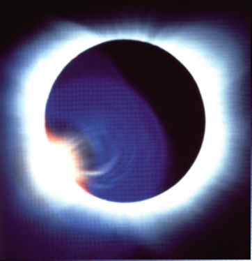 | Eclipse II The moon surrounded by the sun´s huge white corona, the outer part of the sun´s atmosphere, and red eruptions. |