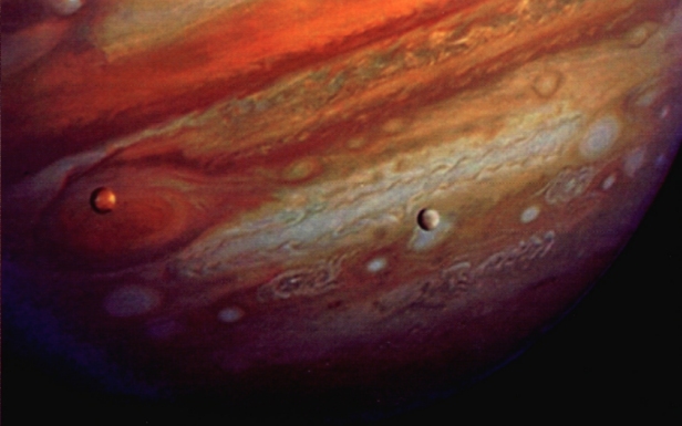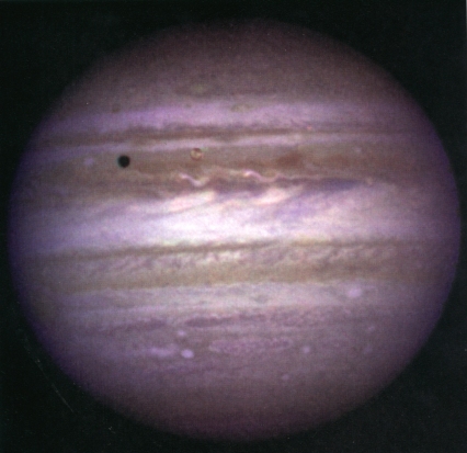 | Jupiter with moons I Jupiter with his little volcano moon Io. The dark point is only his shadow, the moon itself is almost invisible on this picture. Io is responsible for the polar lights on Jupiter for it delivers the necessary ions. In March 1979 Voyager 1 discovered that Jupiter has also two very small rings which can be seen when sunlight illuminates them from behind.. |
