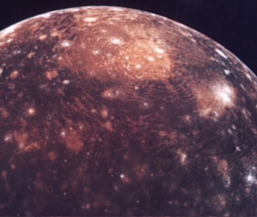 | Kallisto Kallisto´s surface is covered with craters too, this may mean that the moon is geologically dead since about 4 billion years. No moon in the solar system has as similar density of impacts. The concentric circles in the middle of the pictures are caused by one very powerful impact. |