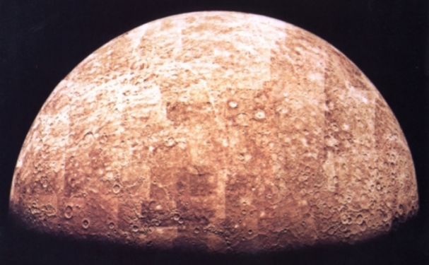 | Mercury The planet´s surface is very similar to the moon´s surface. This picture consists of about 200 shots which were taken at a distance of 200.000 km by Mariner 10 in 1974. |