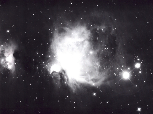 | M42 - Orion Nebula II On this black and white photograph a lot of details can be seen in and around the nebula. The mass of this nebula is about 1000 times the mass of our sun, many stars are still born there. |