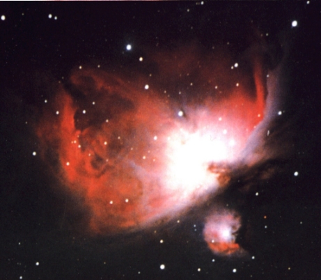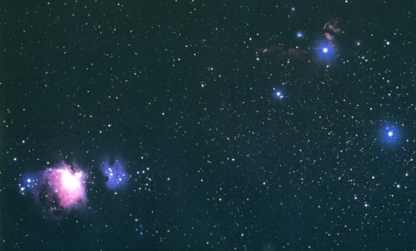 | nebulas in Orion H-alpha region in the Orion constellation. The great Orion Nebula is on the left side of the picture, the Horse Head Nebula on the right side at the upper edge. Below are the three stars that build the Orion Belt. Shot made by O. Guthier. |