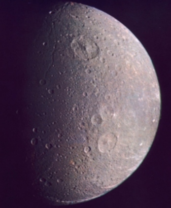 | Dione The moon´s surface is covered with craters and stripes of ice. |