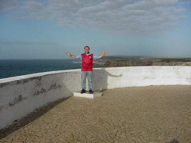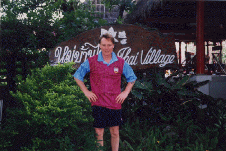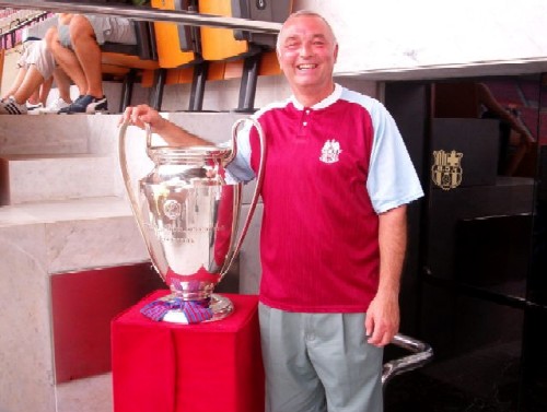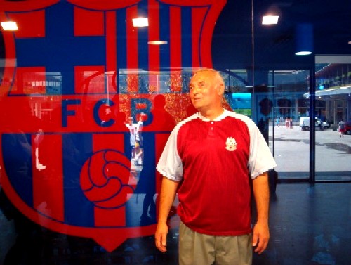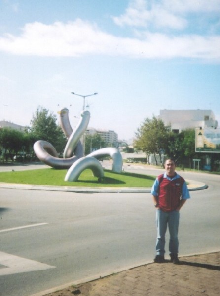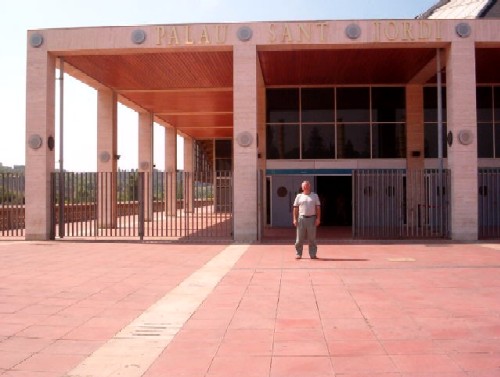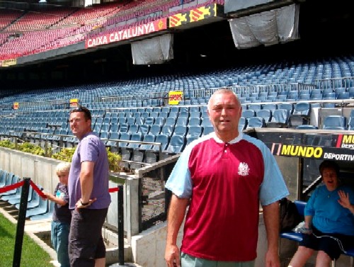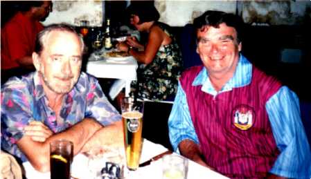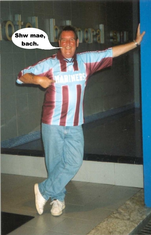 mate, Bill, outside some swanky hotel in Majorca wearing his Mariner's shirt.