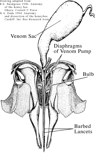 When a honeybee stings a creature, its barbed stinger becomes embedded in the flesh. When the bee attempts to withdraw, the stinger, along with the seventh abdominal segment, are detached and left in the victims flesh. The act of leaving behind the stinger serves a dual purpose. Firstly, the last nerve ganglion and the muscles which operate the poison sac are left in the flesh, so venom continues to be injected. Secondly, the stinger serves the purpose of marking the enemy, signalling other bees to join in the attack.