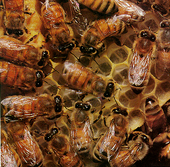 result of communication with the dancing bees. The dancing bees provide information as to the quality of food that is being brought into the hive and therefore indicating the kind of crop they should be seeking. Not only is this true but sharing food gives off similar aromatic waste products from their metabolism. Having similar waste products may allow further recognition within the hive and therefore further helping the guard bees defend against robbers and social parasites. Food sharing therefore helps the colony to feed itself, organize itself, and defend itself. All of these functions tie into the reproduction of the colony. The bees display a truly social behaviour as the bees function as a unit in the struggle for survival. In effect working as a unit allows for the colony, not an individual, to succeed or fail.
