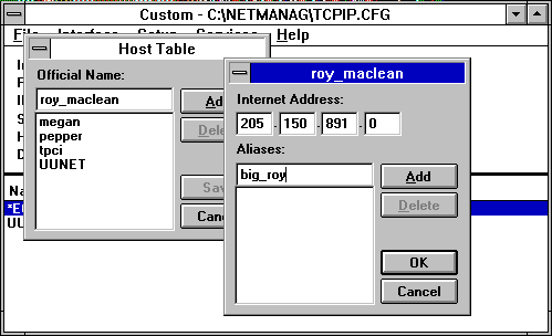 Most TCP/IP implementations on other platforms have a similar type of file to resolve IP addresses from symbolic names. NetManage ChameleonNFS running on a Windows 3.x machine, for example, uses a Host Table to match names and IP addresses. The Host Table, shown in Figure 7.1, is a graphical front-end to a file equivalent to /etc/hosts on a UNIX machine.