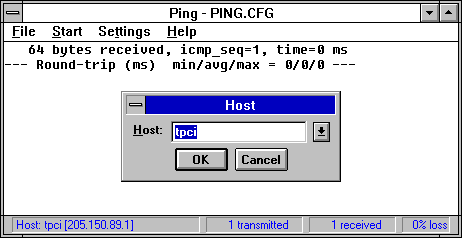 Most non-UNIX TCP/IP implementations provide ping utilities as part of their suite. For example, Figure 7.4 shows the NetManage ChameleonNFS ping utility. The Chameleon ping sends only a single ICMP packet instead of a continuous stream, but is useful for verifying that a remote machine is responding.