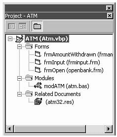 Fortunately, you don't have to do much to manage projects that require multiple files. The Project Explorer window keeps track of things. As you add files to or remove files from the application (by selecting from the menu that appears when you right-click over the Project Explorer window), the Project Explorer window keeps track of the bookkeeping. When you want to modify or add to one of the items in the Project Explorer window, double-click the object's icon in the Project Explorer window, and the form or code opens in the work area (see Figure 5.2).