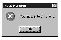 You use input boxes and message boxes when you need to ask the user questions or display error messages and advice to the user. As stated earlier, the form's controls don't often work well for such user dialogs. For example, suppose the user is to enter a sales code of A, B, or C to indicate a discount to be used in a total calculation. Users don't always know what's expected of them, so a message box can pop up when the user enters a bad value and the message box can explain that the user needs to enter only A, B, or C. If the user enters an invalid code, your program could display an error message such as the one shown in Figure 6.2.