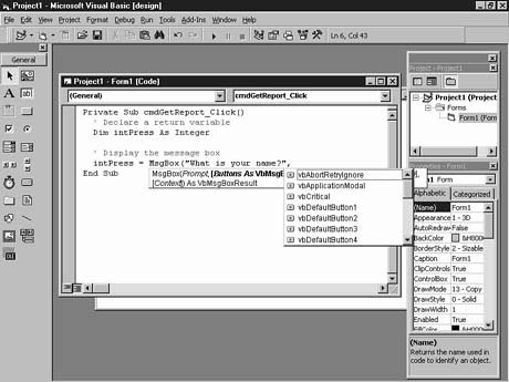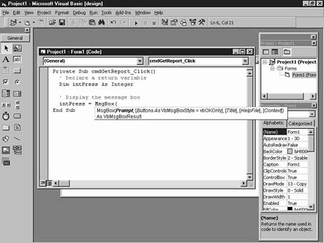NOTE: The format and argument list box pop-up help appears all throughout Visual Basic. As you learn additional Visual Basic statements, you'll see the pop-up Code window help more often.