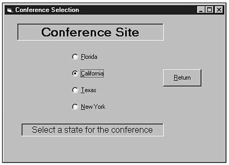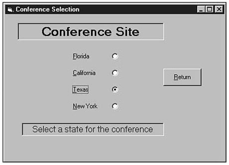 Option buttons act in a mutually exclusive fashion. Only one option button can be selected at any one time. Therefore, in Figure 11.1, the user could not select two or more of the options. If the user were to click Texas, the California option would no longer be selected. You don't have to do anything special to ensure that only one option button is selected at any one time; Visual Basic takes care of removing the former option's selection when the user selects a subsequent option button.