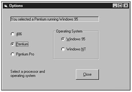 Figure 11.3 shows an application called Controls that comes in the VB Samples folder. (Load the Controls.VBP project and run the application to select the Option Buttons command button and display Figure 11.3's window.) This option button application lets you select a computer type and operating system. Figure 11.3 seems to violate the option button's primary rule: More than one option button is selected at the same time (the Pentium option button and the Windows 95 option).