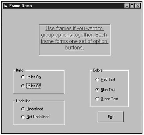 Figure 11.4 shows an application that contains three frames that determine how text appears inside a label. The user can select only one option button inside each frame. As soon as the user changes one of the options, the option button's Click() event responds to the change and sets the Label property accordingly. Listing 11.1 contains the complete form module code that takes care of the user's action. The label is initialized in the Form_Load() event procedure (the procedure that executes right before the user sees the form) and the remaining event procedures are the responses to various user clicks on the form's controls. The controls are named well enough so that you will know where the controls appear in Figure 11.4.