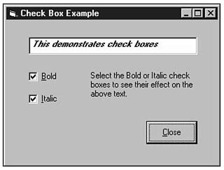 Figure 11.5 shows a form with check boxes. The Check Box control works just like the option button, with two differences: A selected check box shows the selection with a checkmark, and check boxes are never mutually exclusive. Therefore, the user can select one or more check boxes even if those check boxes reside in the same frame or on the same form.
