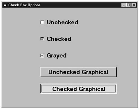 The Check Box control supports the same fundamental properties as the option button except that the Value property determines not only if the box is checked (if 1) or unchecked (if 0), but a check box can also be grayed (if the Value property contains 2). Users sometimes use a grayed check box to determine whether part of a selected option is true. In addition, the programmer may gray out a box to show that the selection is unavailable under the current conditions.