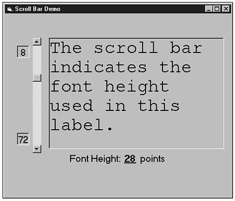 Figure 11.7 shows an application that uses a vertical scrollbar to change the size of a label's font size. As the user clicks the top scrollbar arrow, the font size shrinks by the SmallChange value. As the user clicks the bottom scrollbar arrow, the font size increases by the SmallChange value. (The application's SmallChange property value is 1.) If the user clicks in the scrollbar's shaft on either side of the scrollbar's thumb, the LargeChange property value of 5 is either added to or subtracted from the font size.