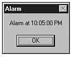 Clicking on the Alarm application's small Form window produces an input box that asks you for an alarm time. The Timer() click procedure from then on compares the current time with the time that the user enters and, if the alarm time has been reached, the alarm goes off. The alarm displays Figure 11.10's dialog box, which informs the user that the alarm time is reached.