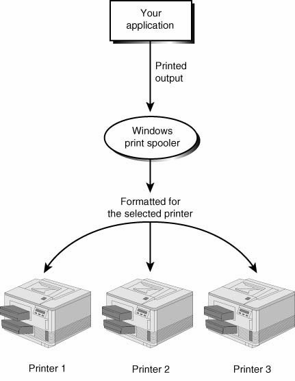 The Windows print spooler simplifies communication with all the various printers. Your Visual Basic application needs only to send output to the Windows print spooler no matter what kind of printer that output will eventually be directed to. The Windows print spooler knows how to communicate with all Windows-supported printers and converts your Visual Basic application's output to the chosen printer's required format.