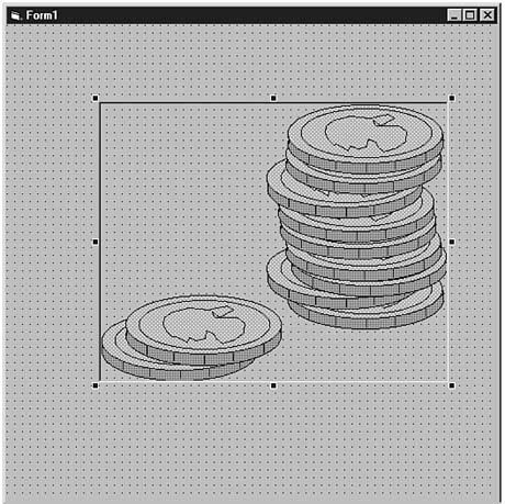 You can select a graphic file that you want to load into the Image control's Picture property, and Visual Basic displays that image on the form. If you were to select the Coins.wmf file located in the Graphics\Metafile\Business folder, you would see the coin metafile appear like the one shown in Figure 18.2. In the figure, the BorderStyle property is set to 1-FixedSingle so you'll know where the Image control edges appear in relation to the image.