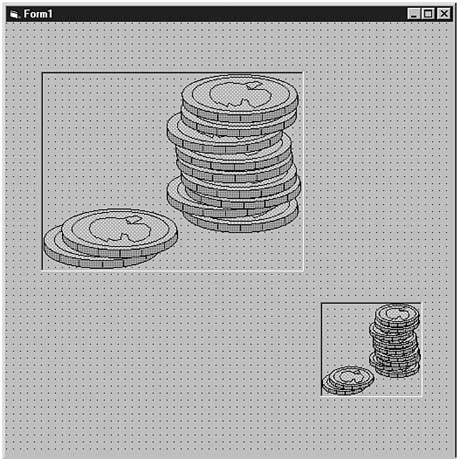 Once you place an image on the form, you can resize the Image control just as you can other controls by dragging its sizing handles out and in. Therefore, after you load an image such as the Coins.wmf image, you can adjust the sizing handles to make the Image control smaller.