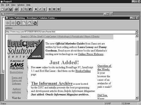 When you finish browsing the Web, you can close the Browser window and continue with your application. Obviously, the wizard's application is still just a shell. Nevertheless, the most functional part of the application is the Web browser, and you can see how simple Visual Basic makes it to drop a browser into an application.
