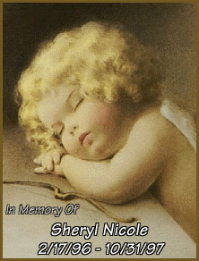 The doctors, while adjusting a pressure band around an arterie, had accidently put a hole in her heart. It wasn't realized until it was too late. Her lungs had filled with blood, and she slipped into a coma. I got to the hospital just in time for my sister, absolutely devestated, to fall into my arms, sobbing uncontrollably, she had to make the heart wrenching decision to pull the plug. It was not a decision of living, or dying at this point, it was a matter of when to let her go. I was mortified. My angel baby, my little sister, I couldn't make it better for her, as I always had when she was litle. On Halloween, 1997, little Sheryl Nicole took her last breath, in the arms of her mother, and her Aunt, forever scarred by the last memory we have of her. It was the hardest thing I will have ever done on this Earth. I wanted to run, to deny, but I couldn't. I was here when she came into this world, and there when she left. I am greatful, yet scarred for life, of the picture that was once so perfect, now lost forever, little Sheryl Nicole.