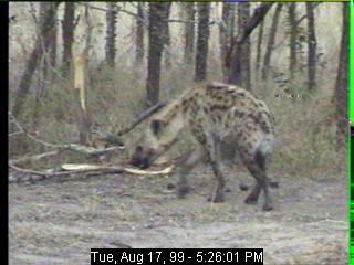 Description: Its ungainly appearance is unmistakable. They have heavy fore quarters which slope down to relatively slender hind quarters and they have immensely powerful jaws which are reputedly the strongest of all mammals. With the exception of the head, neck and lower parts of the legs, the body is covered in spots. Females are larger than males, weighing up to 80kg and standing 80cm at the shoulder. There are four digits on each foot armed with non-retractable dog-like claws. | Spotted Hyaena | ||||||||||||||||||