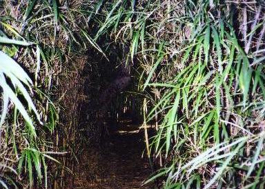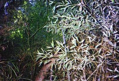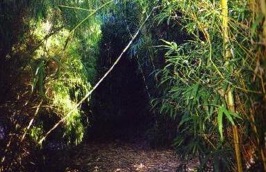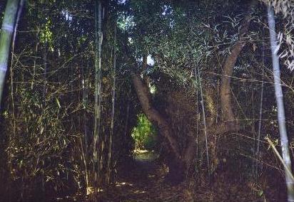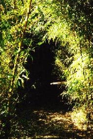 The pictures on this page show a trail through a not-very-wide but very thick bamboo forest, my favorite part of the arboretum. In most places along the trail, the sunlight was almost completely blocked out by the thick interwoven foliage above. It was so dense, in fact, that you almost feel like you really are in a jungle. But it was a refrigerated jungle -- the temperature inside the forest was about fifteen degrees lower than the outside temperature.