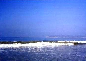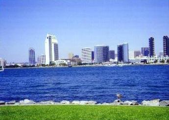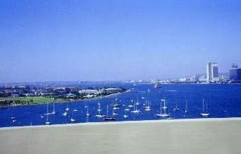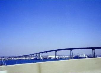 Traveling west on the Coronado Bay Bridge, which connects Coronado (at left) with San Diego (at right).