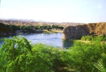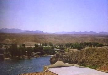 The view out of our hotel window. I'm looking southeast, across the Colorado River; that's Arizona on the other side.
