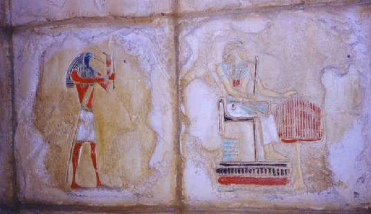 Part of a fresco outside the main entrance, showing the god Thoth at left and a pharaoh at right.