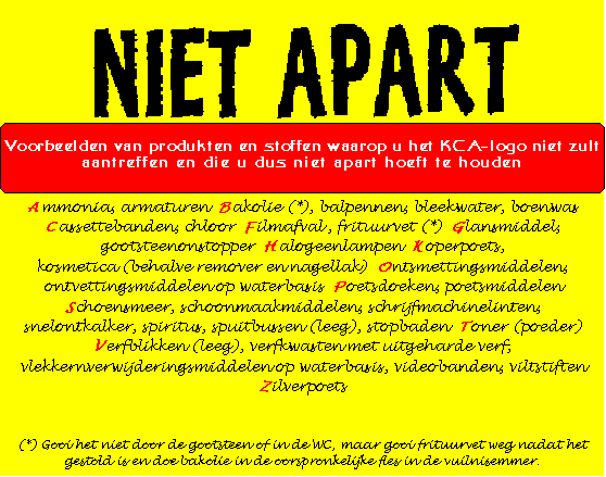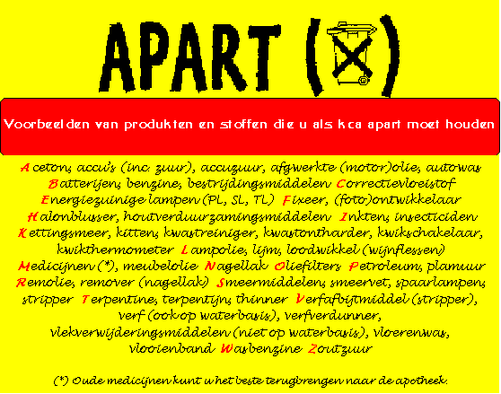 | Houd echter alleen chemisch afval apart en raadpleeg bij twijfel de lijst 'Apart / niet Apart'. De kosten van verwerking zijn namelijk veel hoger dan van gewoon afval en het aantal verwerkingsmogelijkheden in ons land is beperkt. |