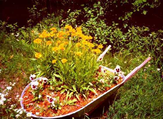 What would a Wisconsin yard be without the obligatory old, rustic wheelbarrow overflowing with flowers. I threw in a few pansies to complement several coreopsis granfloras.