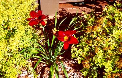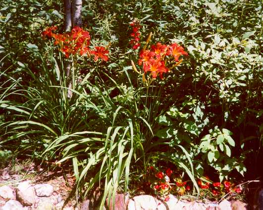 Sammy Russel is a deep orangy red daylily with yellow star centers grow on both sides of the pond.