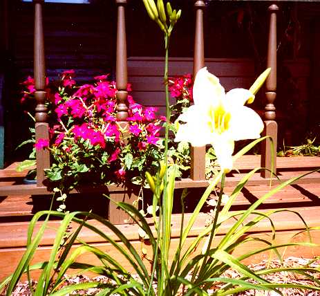 Ice Carnival is a creamy, almost white, tall daylily. It stands out well with nicotiana in the background.