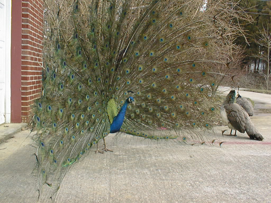 Vi har ofte hatt bes�k av denne p�fuglen og hans fire h�her, i det siste. Det ser ut som de liker seg forran garasjen v�r! Er de ikke fine?