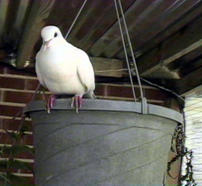 Some of my white ringneck doves. These pure white birds of peace are docile and easy to handle. I get a tremendous amount of joy in watching them raise their young. They normally use nest boxes near the kitchen windows, but the pair on the right chose the hanging planter to lay their eggs.