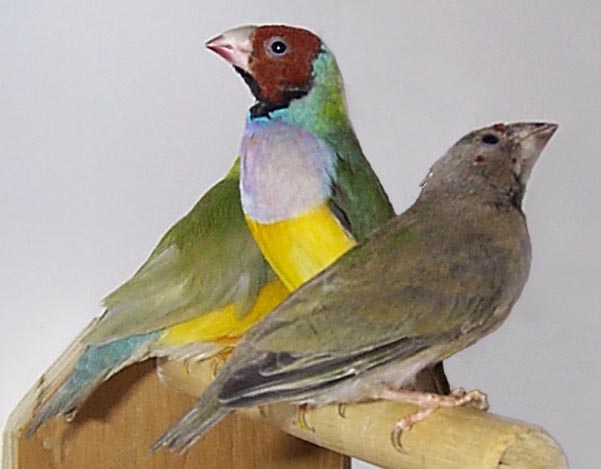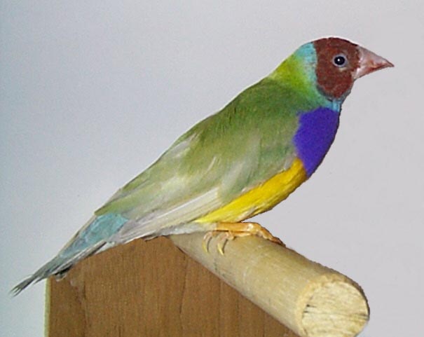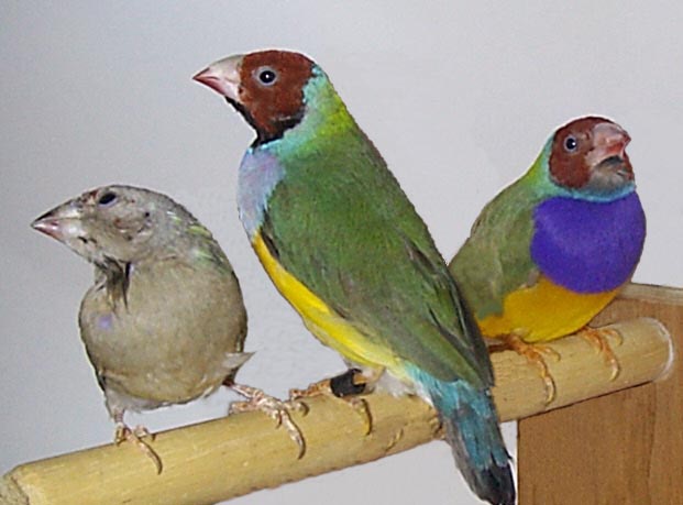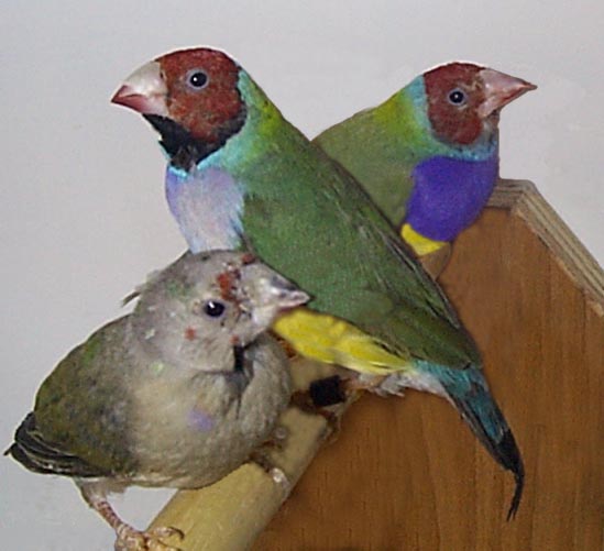 The photos above are of two adult Gouldian finches and a young chick. The chick goes through a molt between its gray/green feathers and its final multicolored features. During this molt there are various patches of color throughout its body that may be unattractive to some. To a fancier, it is an exciting period. There is always a question about the quality of the color and even what will the colors be if the parents are genetically split to other colors.