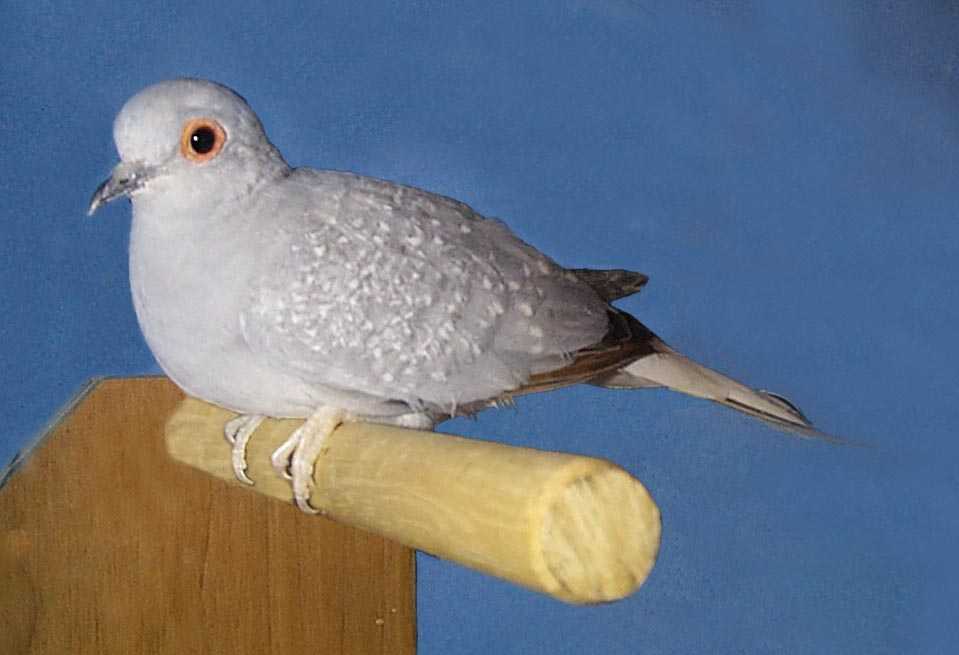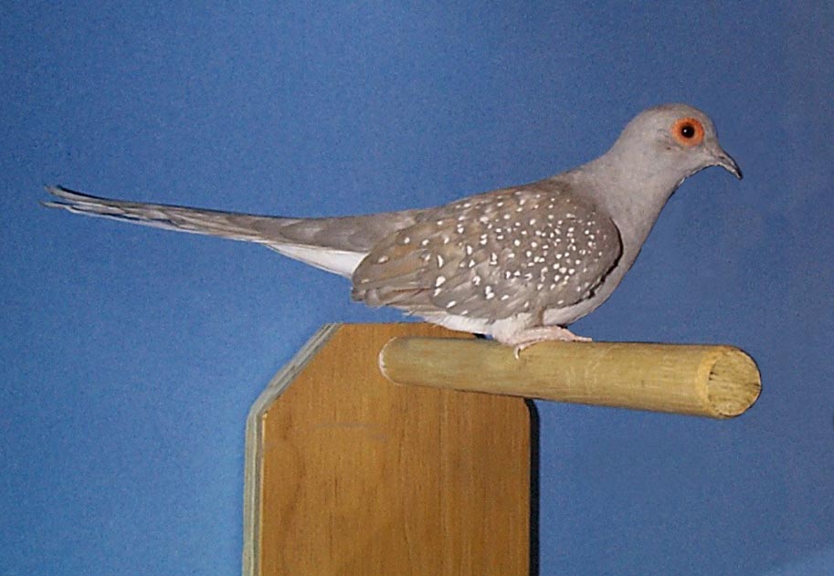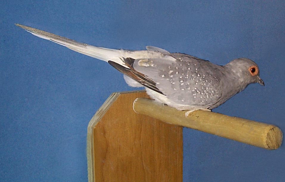 The two diamond doves on the left are called Normals while the two on the right are called Silver White Tail diamond doves. They are a small species of dove native to Australia. Their "coo" is much more subdued and muted than the full sized doves. The term "diamond" stems from the white spots on the wings. There are a variety of color shades and the names are derived from the color associated with the bird. My links page contains addresses of pages which will show or describe this variety of colors.